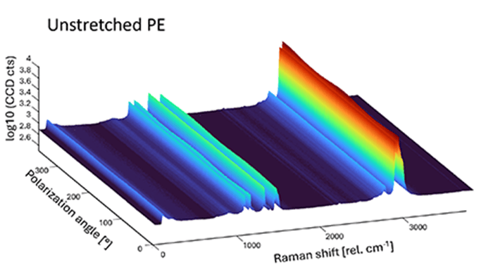 プラスチック材料内のポリマー繊維の分子構造と配列は、ポリマーの物理的特性(安定性、柔軟性、透明性など)に大きく影響します。偏光分解ラマン分析は、材料の分子構造を決定し、ポリマー繊維の配向を特定するのに役立ちます。スイス連邦材料科学技術研究所(Empa)で行われた研究では、偏光分解ラマン顕微鏡を用いて、プラスチックフィルム中のポリエチレン繊維の配向を解明しました。これにより、伸張条件下での材料内の繊維の配向特性を特徴付けることが可能になりました。
